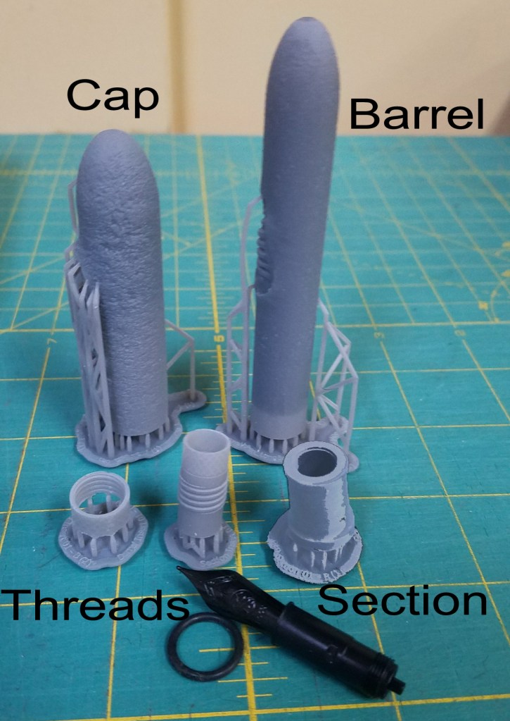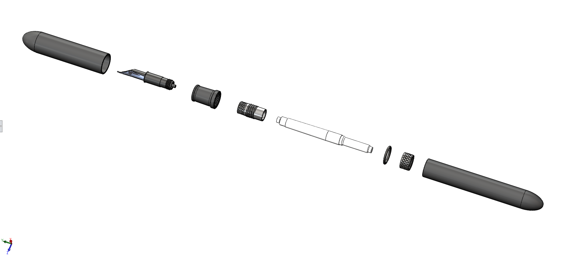 The basic components of the Moonwalk Pen were designed using SolidWorks 3D computer modeling software. These parts include: barrel, cap, section, and threaded inserts.