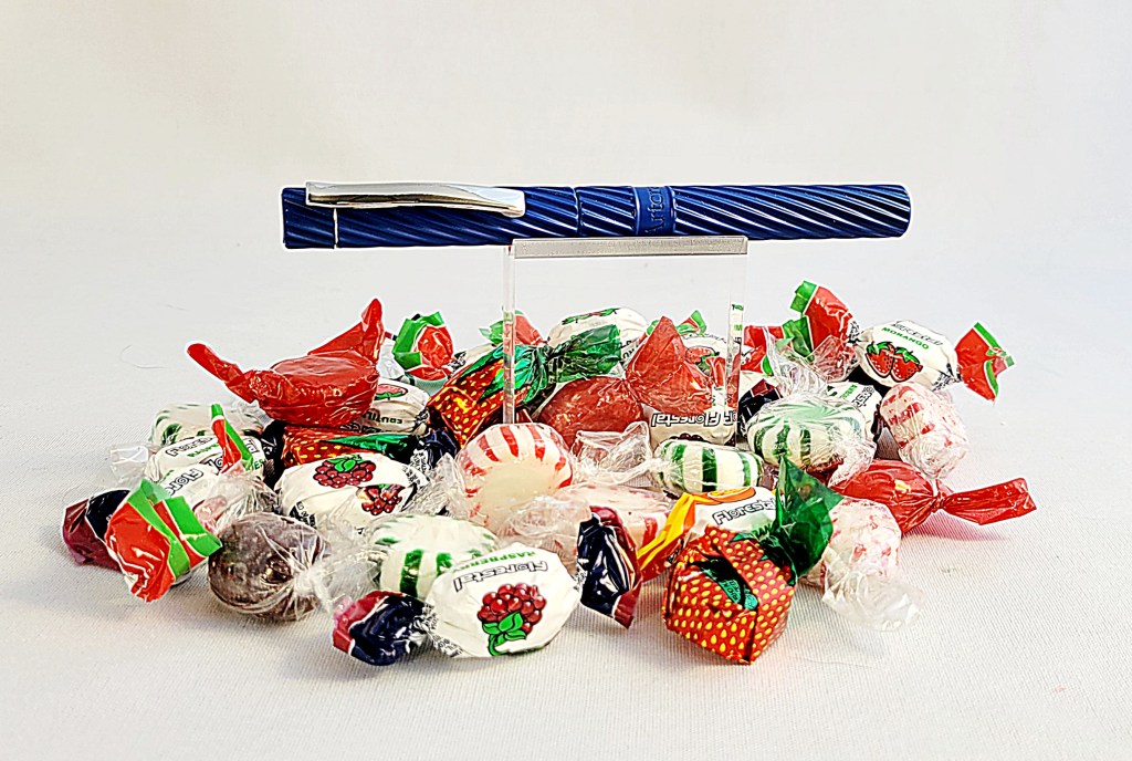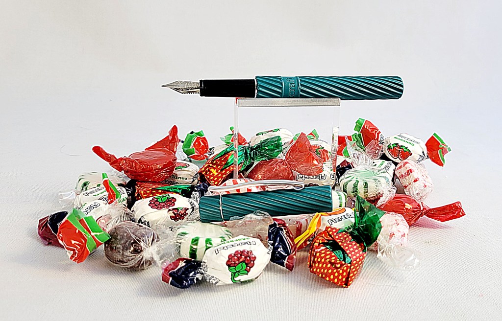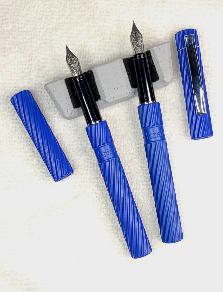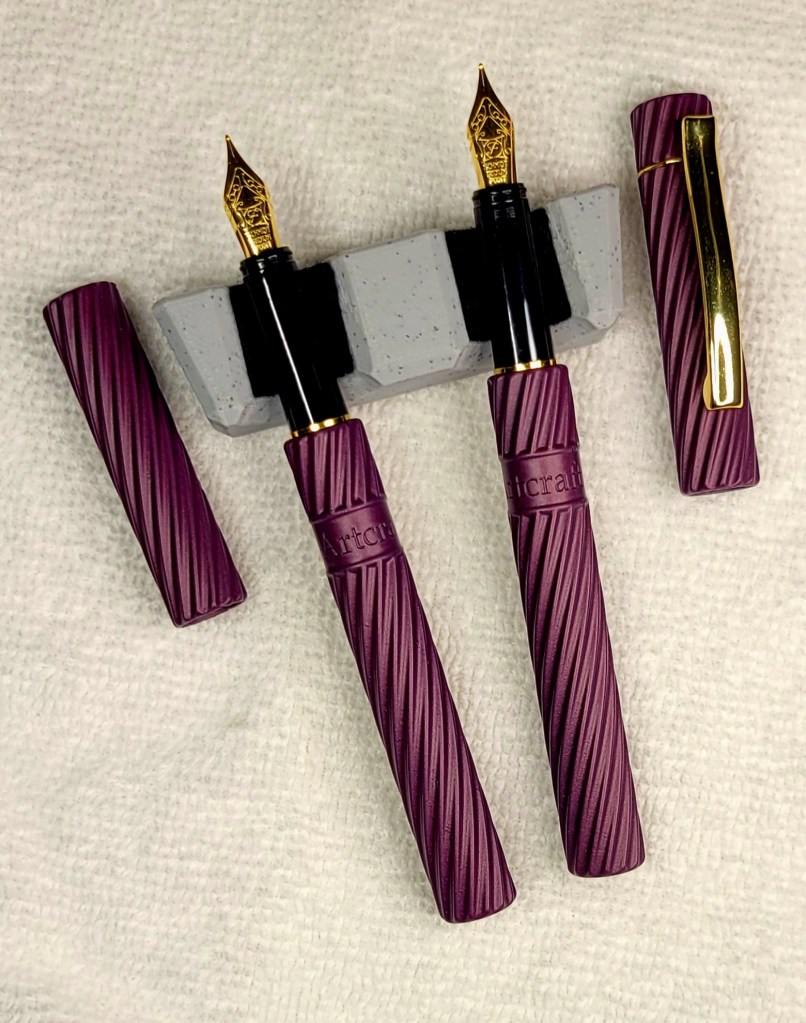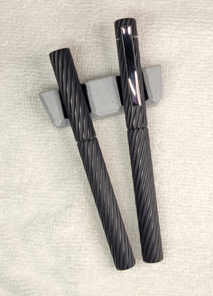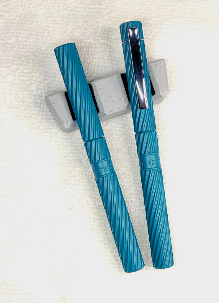 The Spiral is entrancing, with tactile, eye-catching spirals reminiscent of vintage pens. It is available in SIX colors, Blue, Teal, Red, Black Cherry, Black, and Gold with black highlights, with two variations, clipless or with a pocket clip. All varieties are available as fountain pen or rollerball.