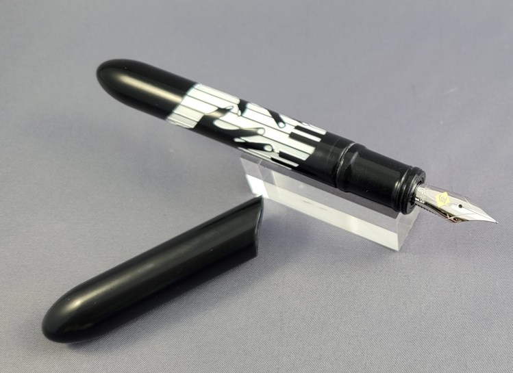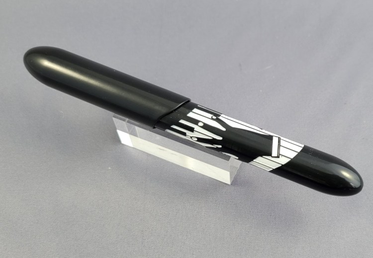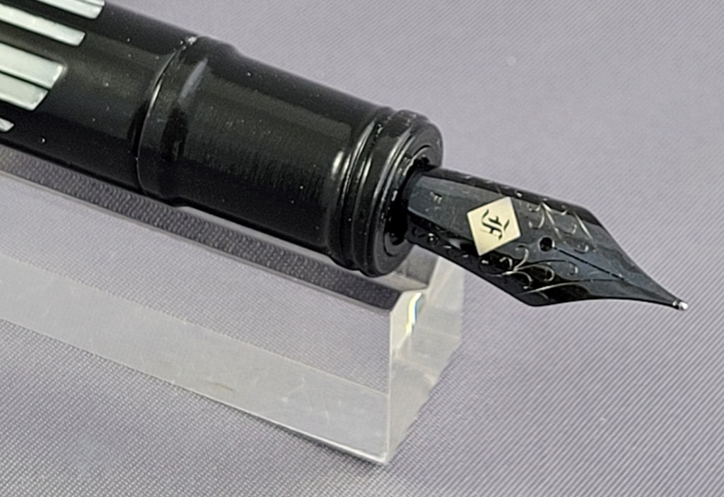 A glossy black finish and curves evocative of a grand piano combine with dynamic hands flashing across the keyboard to arouse the musician in all of us. Like a classical musical composition, just 1 1/2 quick turns of the cap reveal a beautiful #6 size nib, ready to glide your thoughts smoothly onto paper.