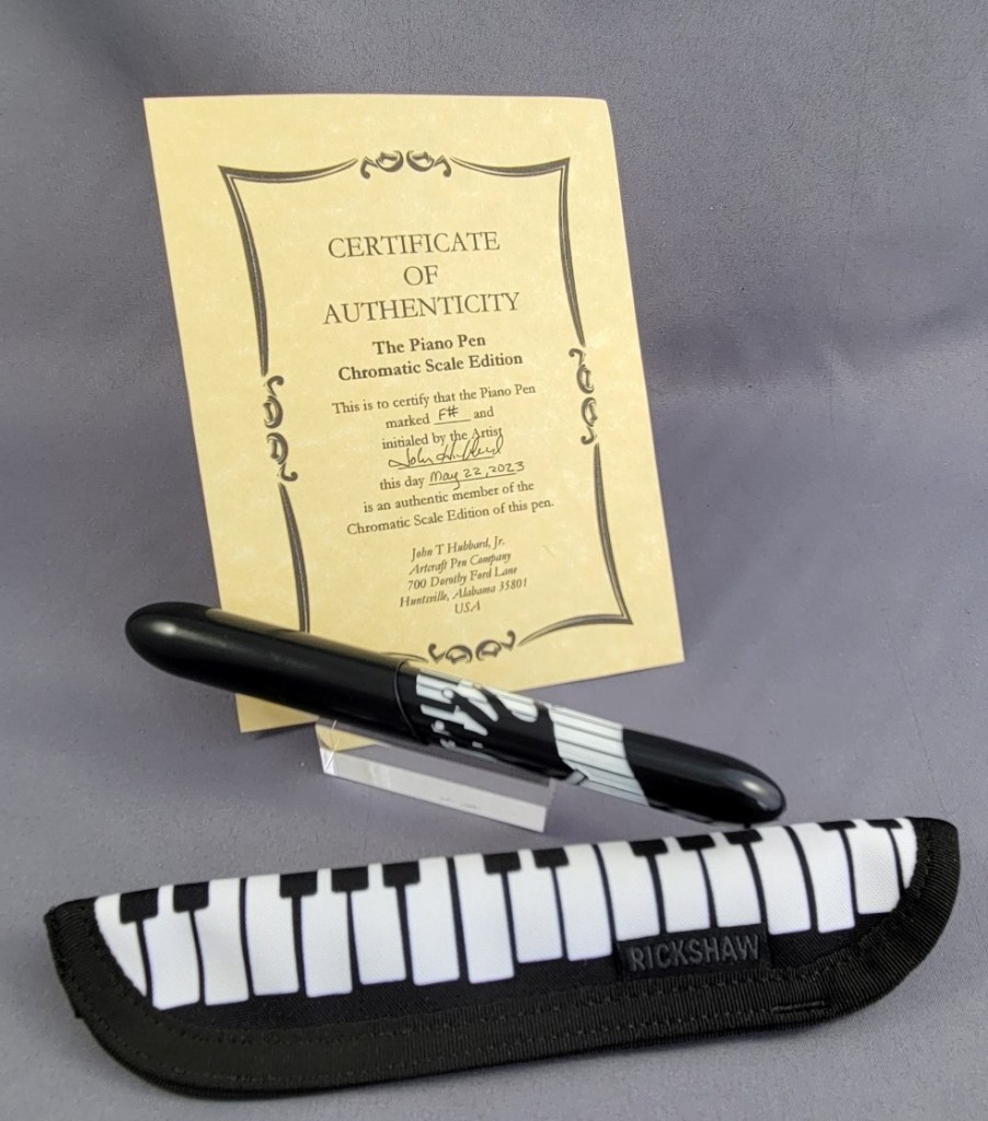 Both the Chromatic and Keyboard Editions include a keyboard-themed protective pen sleeve by Rickshaw Bagworks of San Francisco, a Certificate of Authenticity signed by the designer, John Hubbard, and a Schmidt K5 converter.